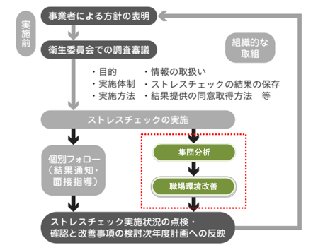 ① ストレスチェック・集団分析の実施 ② 職場環境改善方針、目標(定量・定性指標)の設定 ③ 結果報告・方針説明(経営陣向け) ④ 結果報告・方針説明(職場向け) ⑤ 職場環境改善活動の実行 |