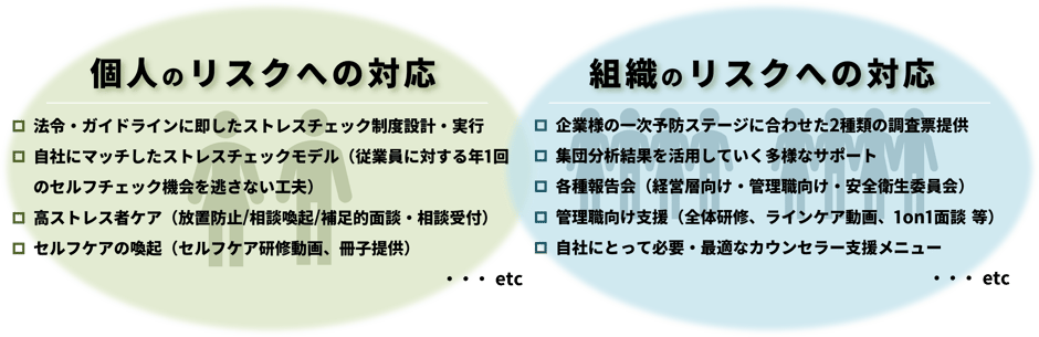 集団分析活用をはじめ、ストレスチェック制度を活かしていく各種取り組みも幅広くご用意。メンタルヘルス研修や定期カウンセリング等、カウンセラーサービスも充実しております。